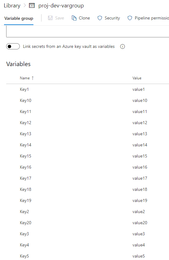 Note: It’s definitely very easy to copy/paste as there are just 20 Key-Value pairs in this scenario. However, think about a scenario where you need to repeat this for many Variable Groups for multiple project? It’s definitely a tedious job and there is a scope for human-error.