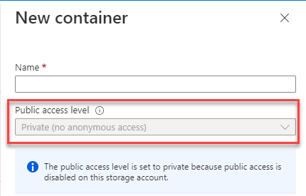Once the option is disabled, you will not be able to create the container with public access. As shown below the Public access Level dropdown has beendisabled.
