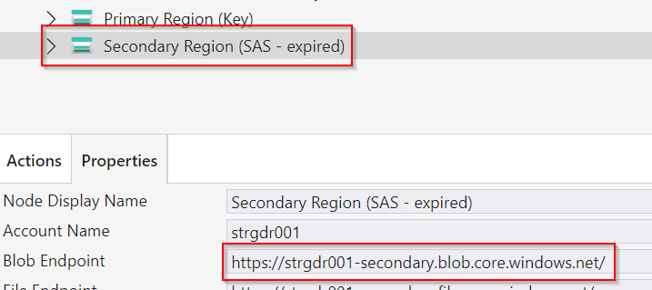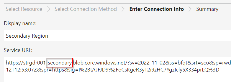 While connecting to the Secondary Region using the above SAS token, please make sure that you add -secondary to the storage account name as shown below.