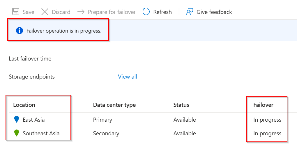 Let’s now understand how to perform the Planned Failover by navigating to the Redundancy blade and review the Primary & Secondary regions (after failover, these two regions would swap)