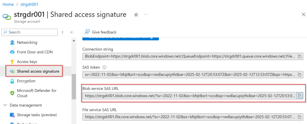 Secondary Region: Connect the Storage account using SAS Token. For this, create a SAS token as shown below and copy the Blob Service SAS URL.