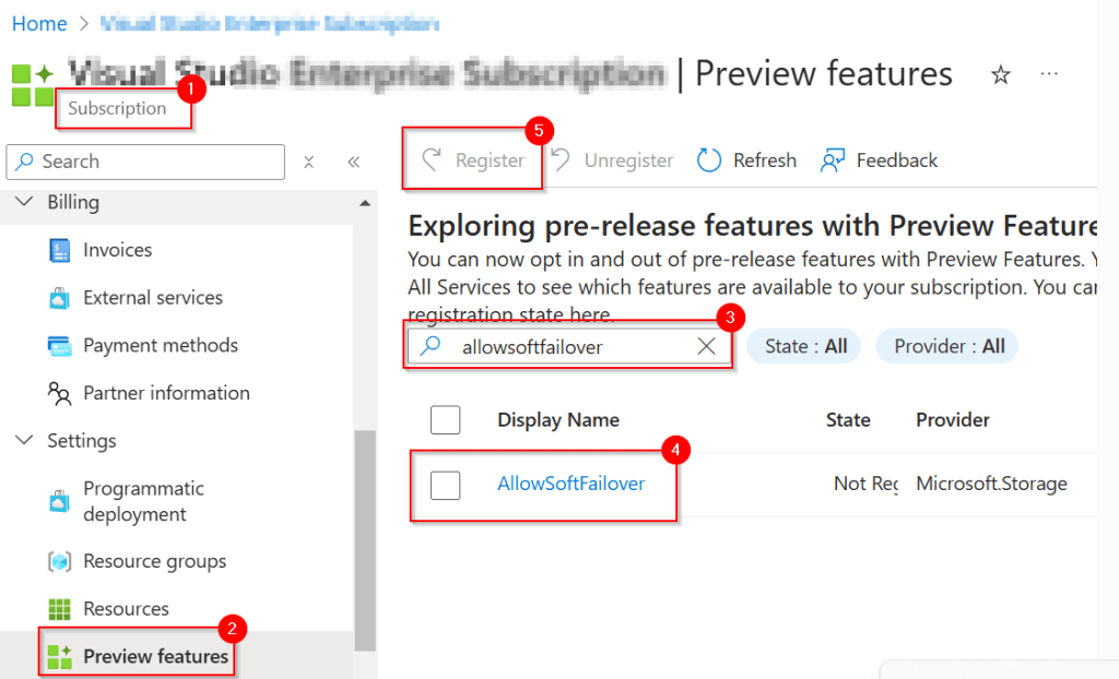 To use Planned Failover, you must register the AllowSoftFailover feature at the subscription level as shown below.